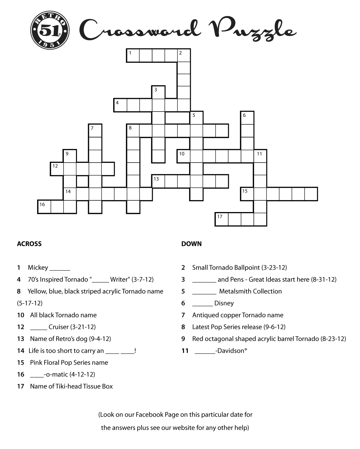 Fill out this crossword puzzle and email to us at richard(at)retro51(dot)com. The first person to complete the puzzle correctly will win an Invader Tornado plus a Retro 51 t-shirt (sizes S-XXXL). Nine other people will also win a free Retro 51 shirt for entering. Good luck!