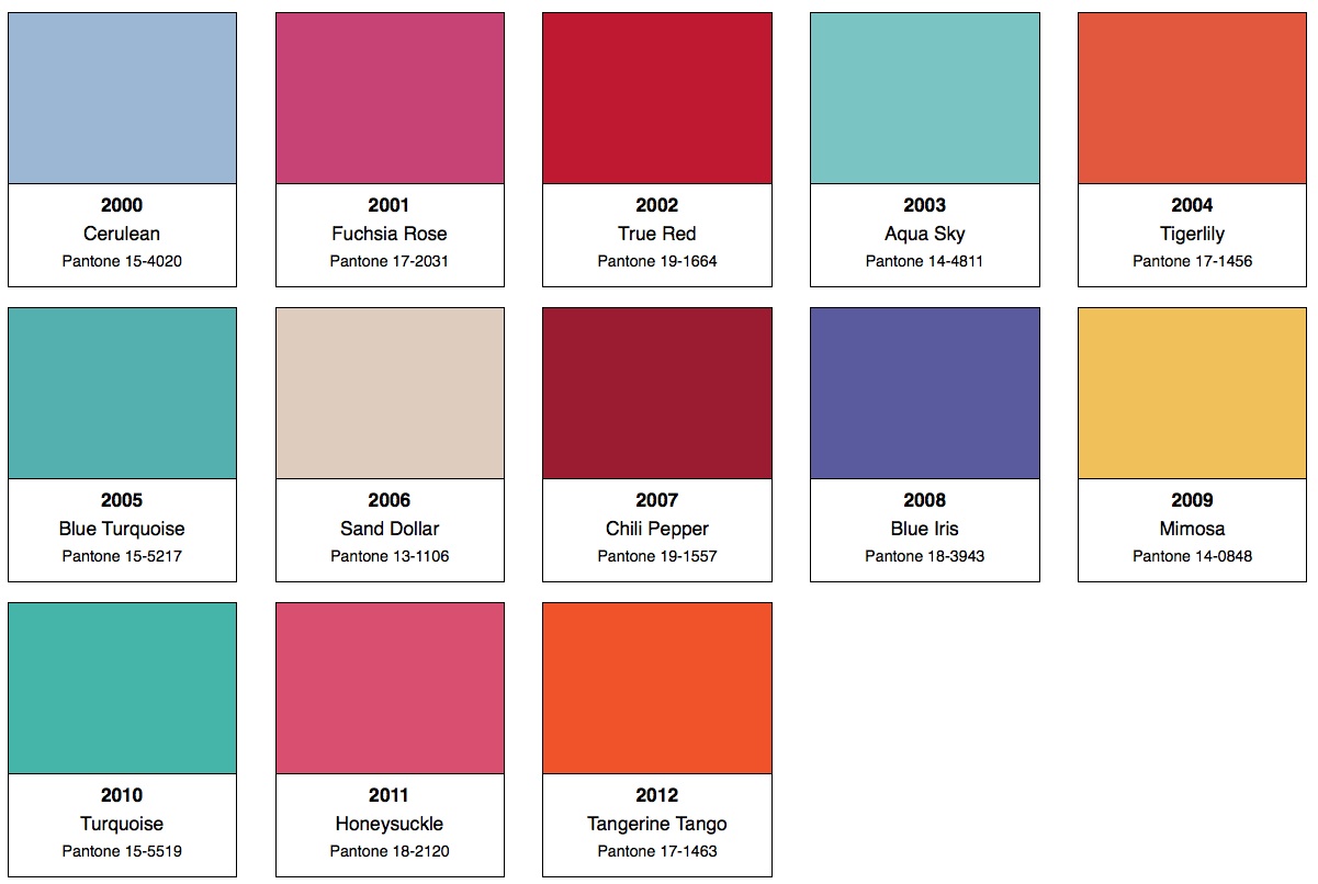“To arrive at the selection, Pantone quite literally combs the world looking for color influences. This can include the entertainment industry and films that are in production, traveling art collections, hot new artists, popular travel destinations and other socio-economic conditions. Influences may also stem from technology, availability of new textures and effects that impact color, and even upcoming sports events that capture worldwide attention.” (More here)